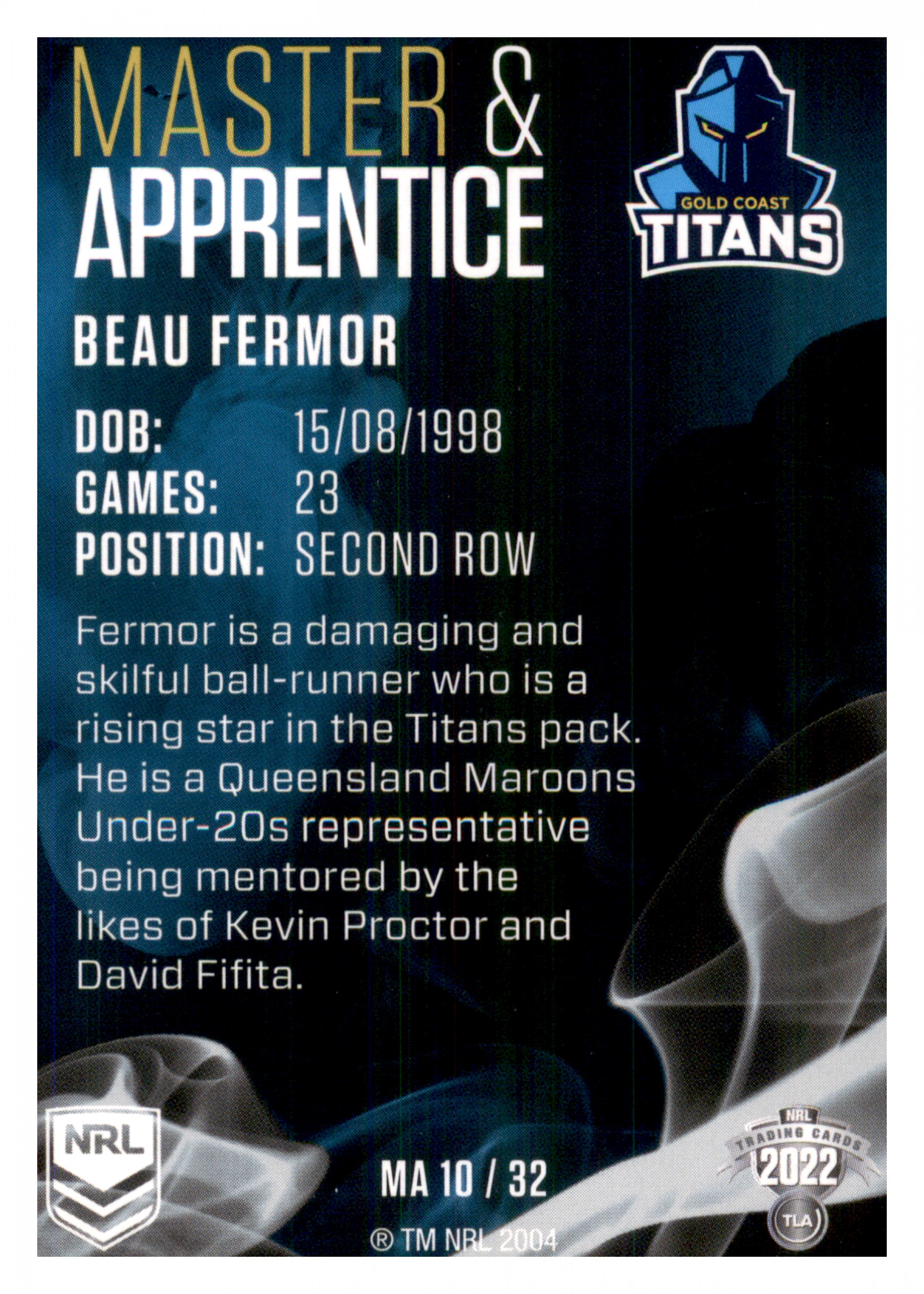 2022 TLA NRL TRADERS MASTER & APPRENTICE CARD MA10 BEAU FERMOR - GOLD COAST TITANS