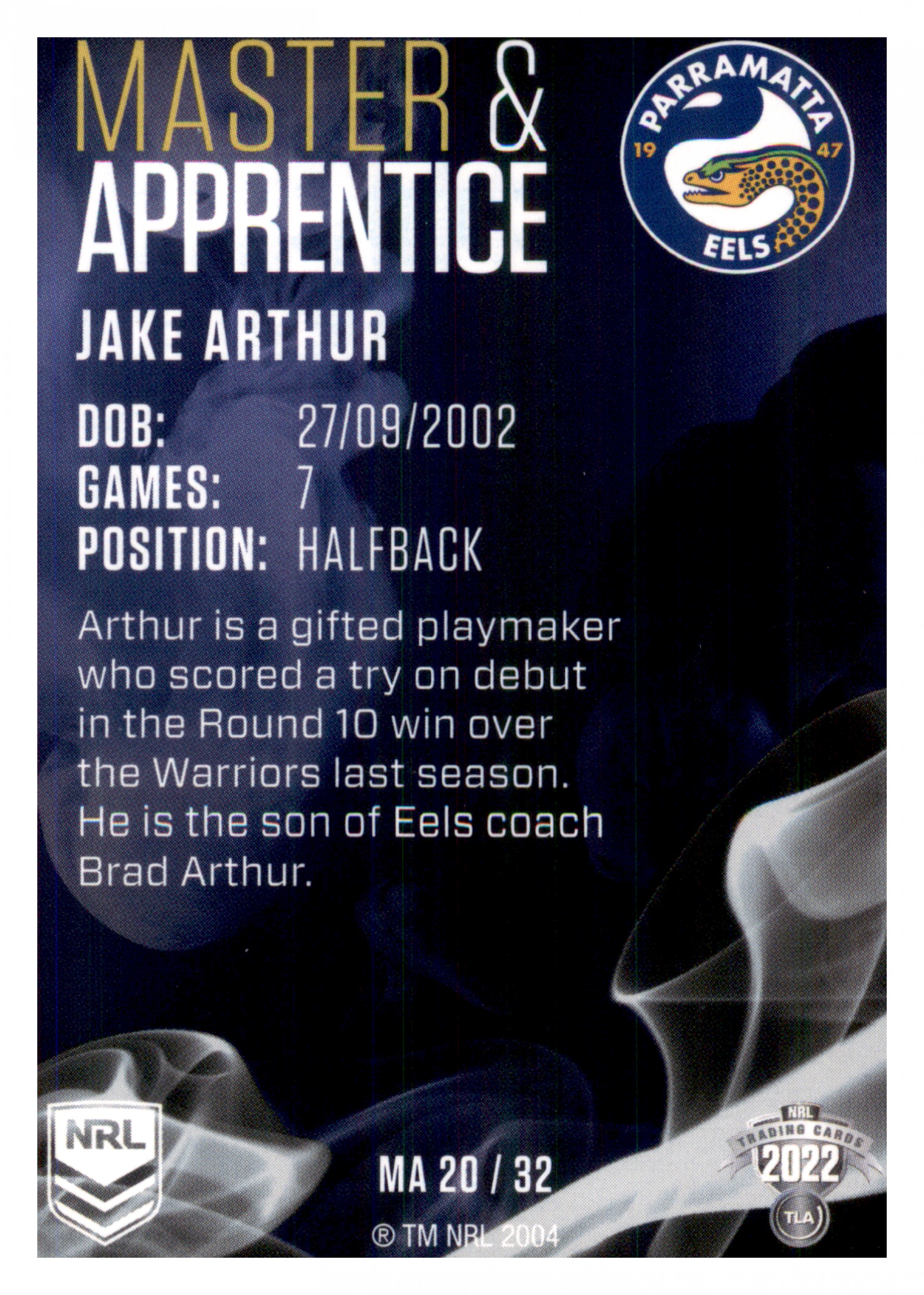 2022 TLA NRL TRADERS MASTER & APPRENTICE CARD MA20 JAKE ARTHUR - PARRAMATTA EELS