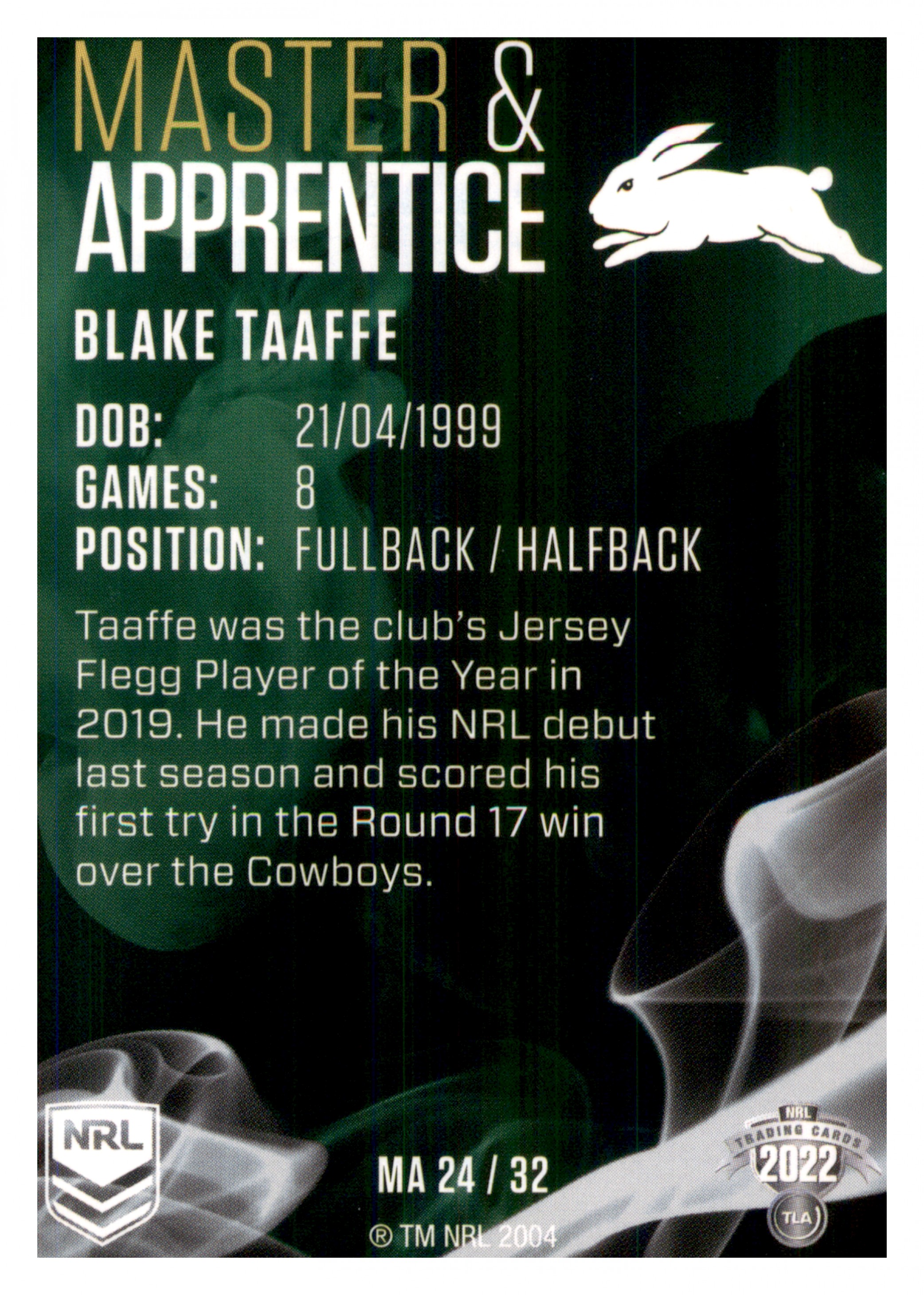 2022 TLA NRL TRADERS MASTER & APPRENTICE CARD MA24 BLAKE TAAFFE - SOUTH SYDNEY RABBITOHS