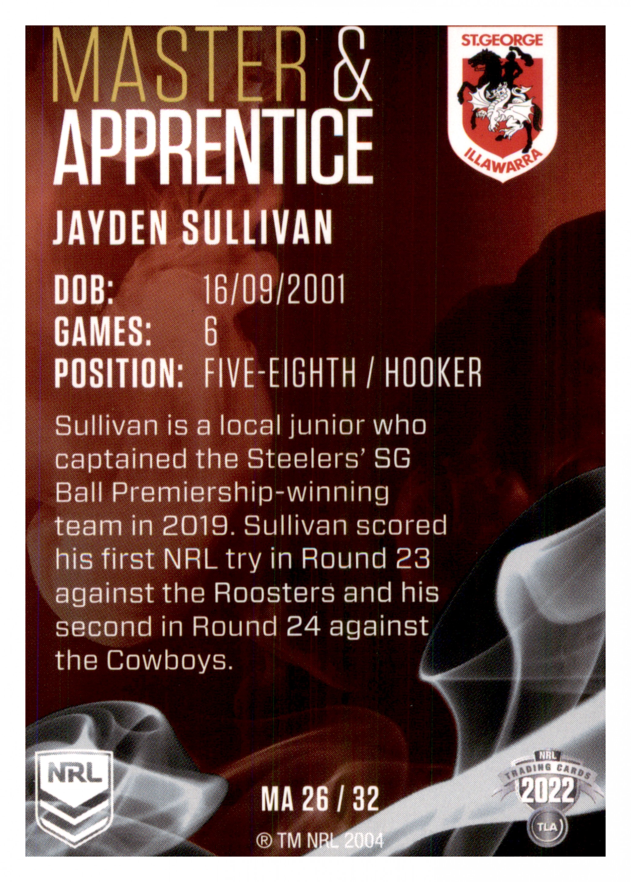 2022 TLA NRL TRADERS MASTER & APPRENTICE CARD MA26 JAYDEN SULLIVAN - ST GEORGE ILLAWARRA DRAGONS