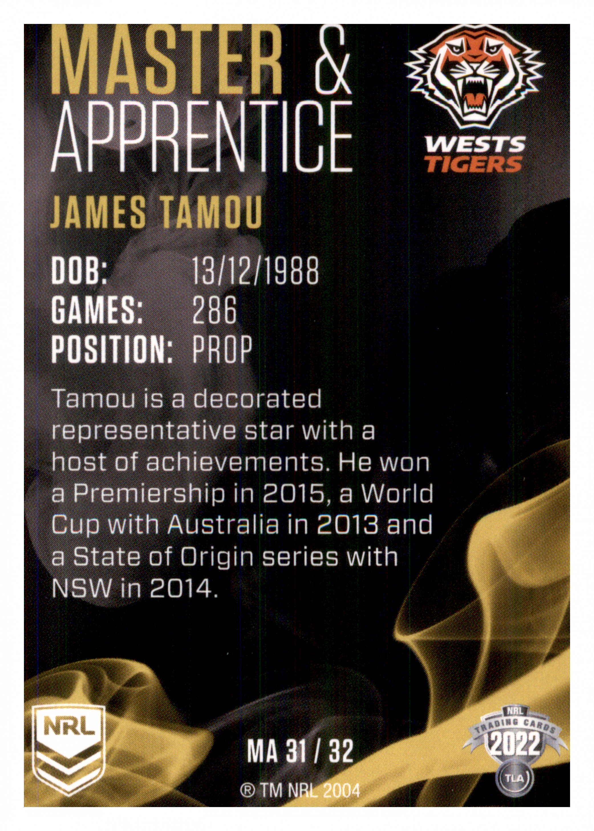 2022 TLA NRL TRADERS MASTER & APPRENTICE CARD MA31 JAMES TAMOU - WESTS TIGERS