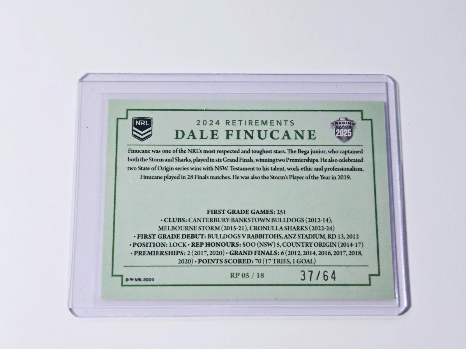 2025 NRL TRADERS TITANIUM RETIREMENTS CASE CARD SHARKS DALE FINUCANE #37 / 64