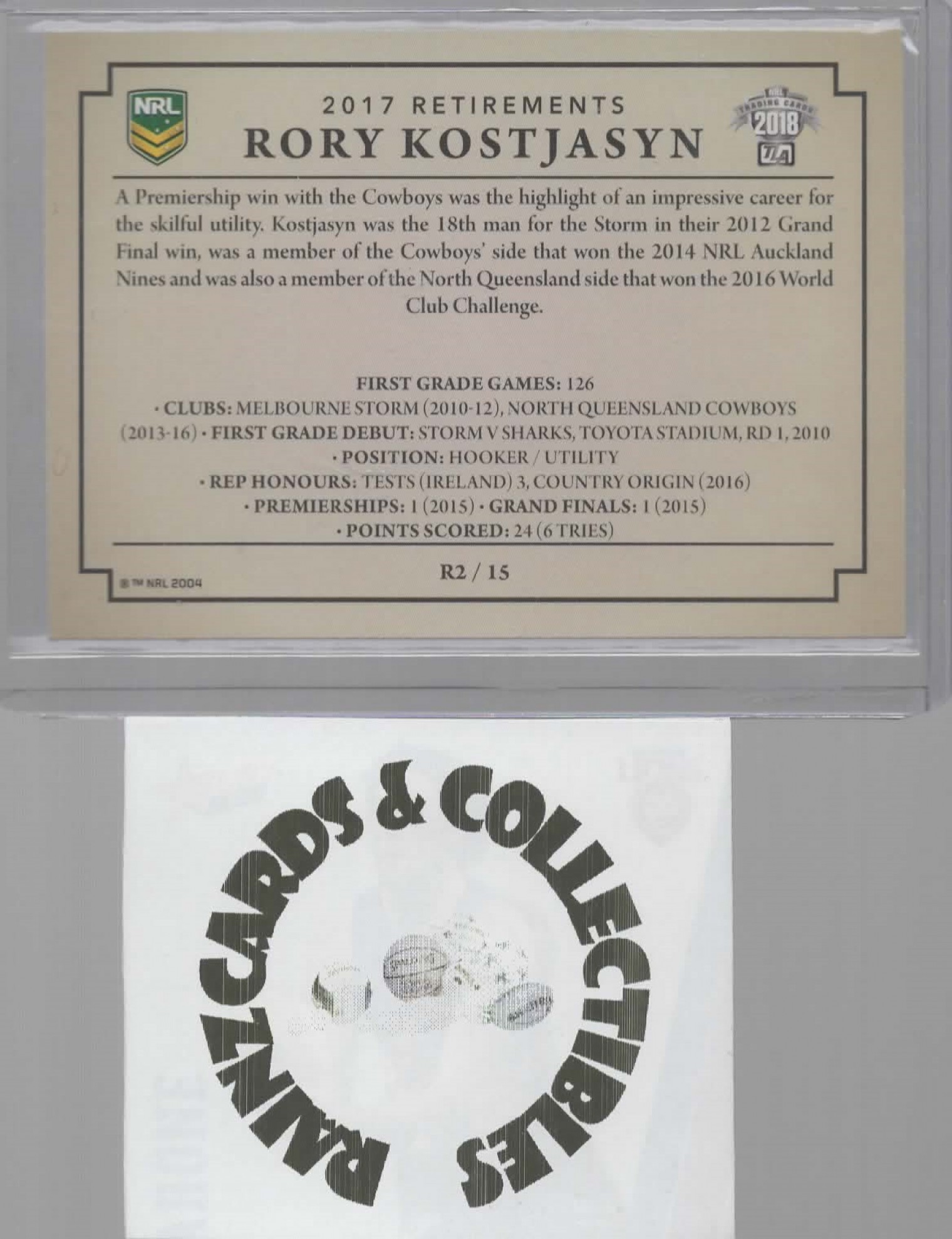 2018 TLA NRL TRADERS RETIREMENTS CARD R2 RORY KOSTJASYN NORTH QUEENSLAND COWBOYS