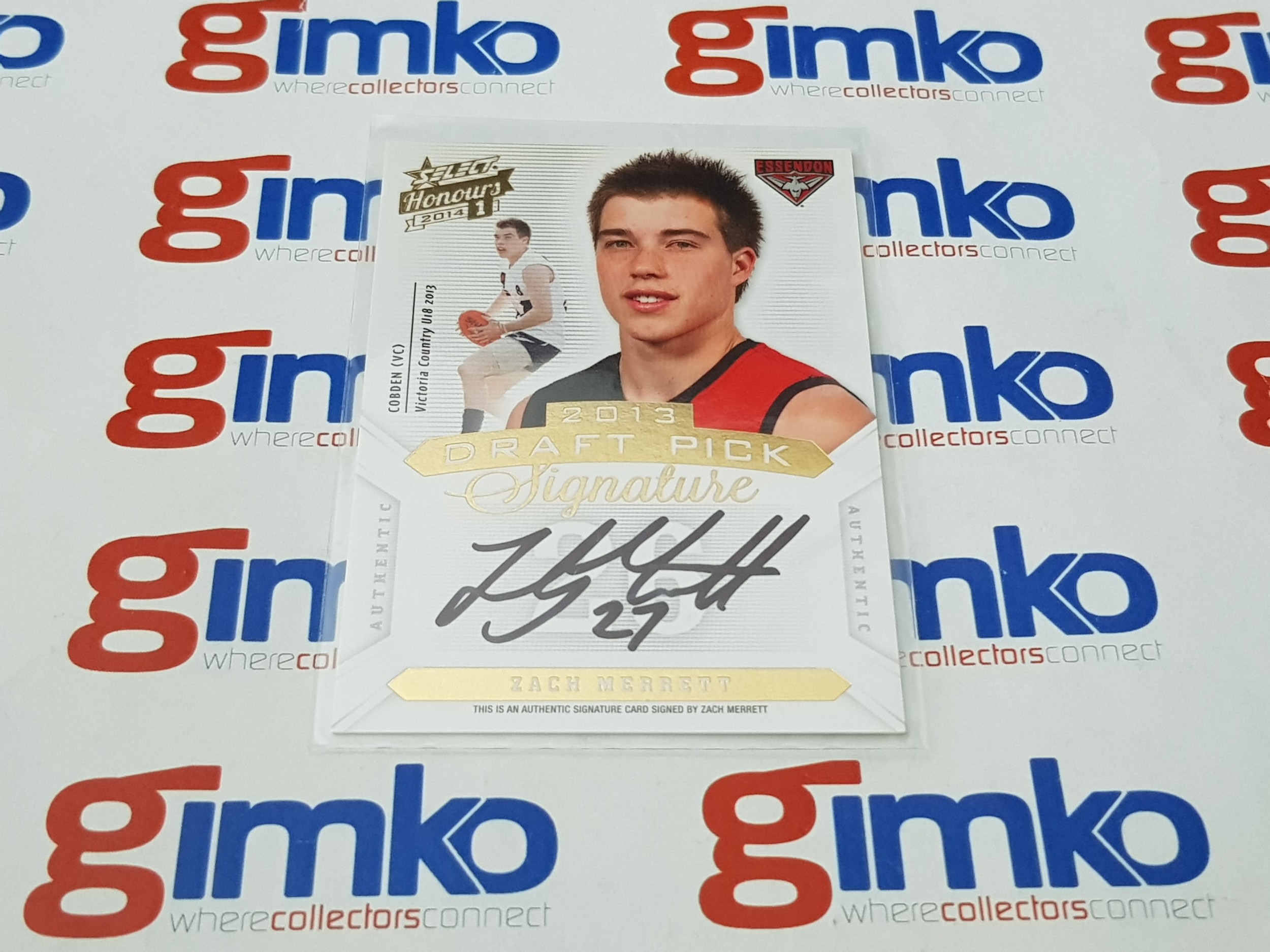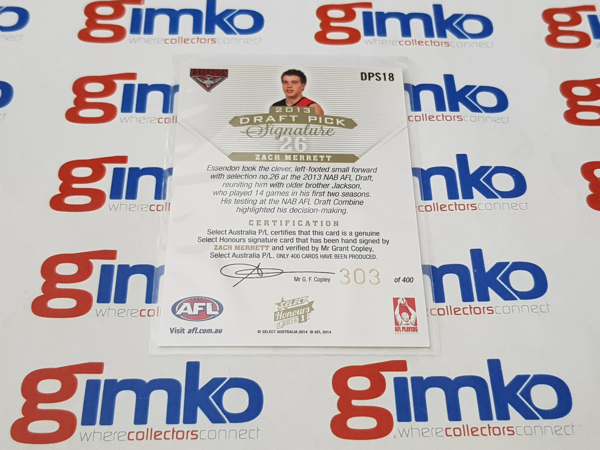 2014 AFL SELECT HONOURS DRAFT PICK SIGNATURE DPS18 ZACH MERRETT - ESSENDON BOMBERS #303/400