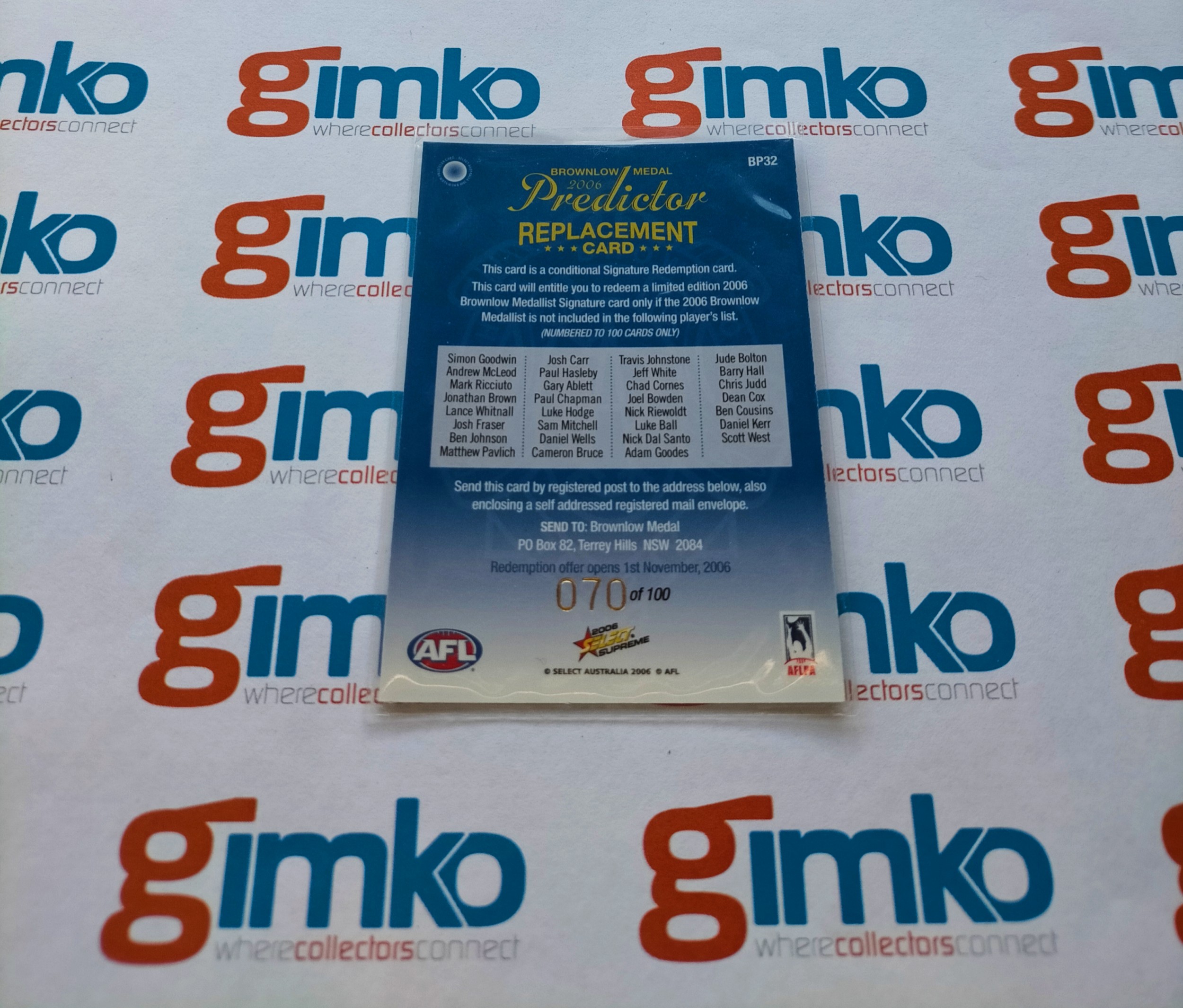 2006 AFL SELECT SUPREME BROWNLOW MEDAL PREDICTOR BP32 HEADER LOGO CHECKLIST CARD #070/100
