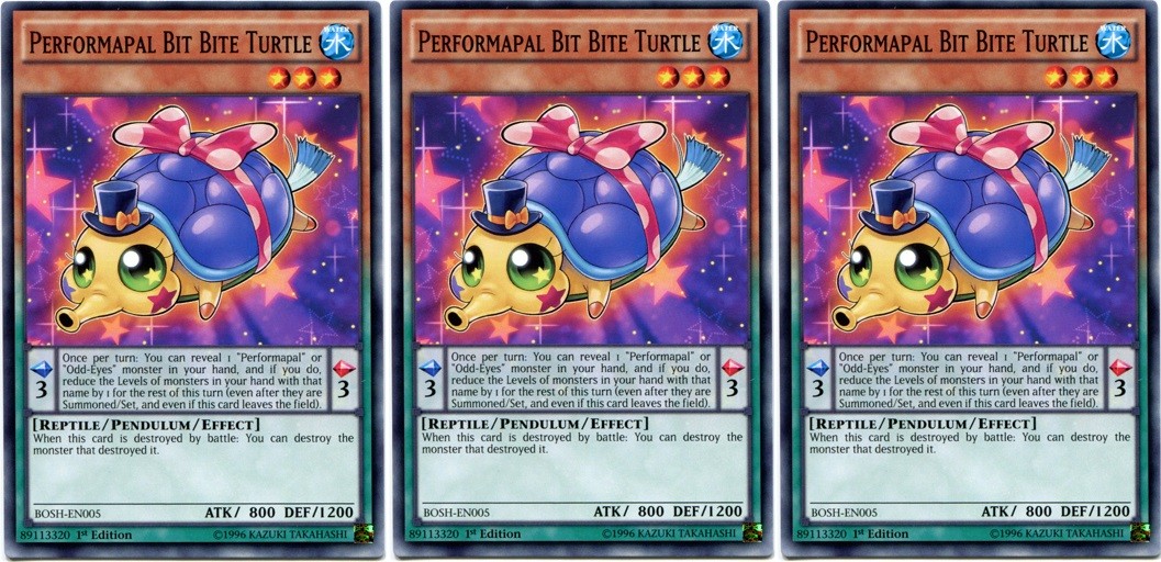Item: 3 copies of Yu-Gi-Oh! Performapal Bit Bite Turtle (BOSH-EN005) - Common - NM-MINT - 1st Edition
