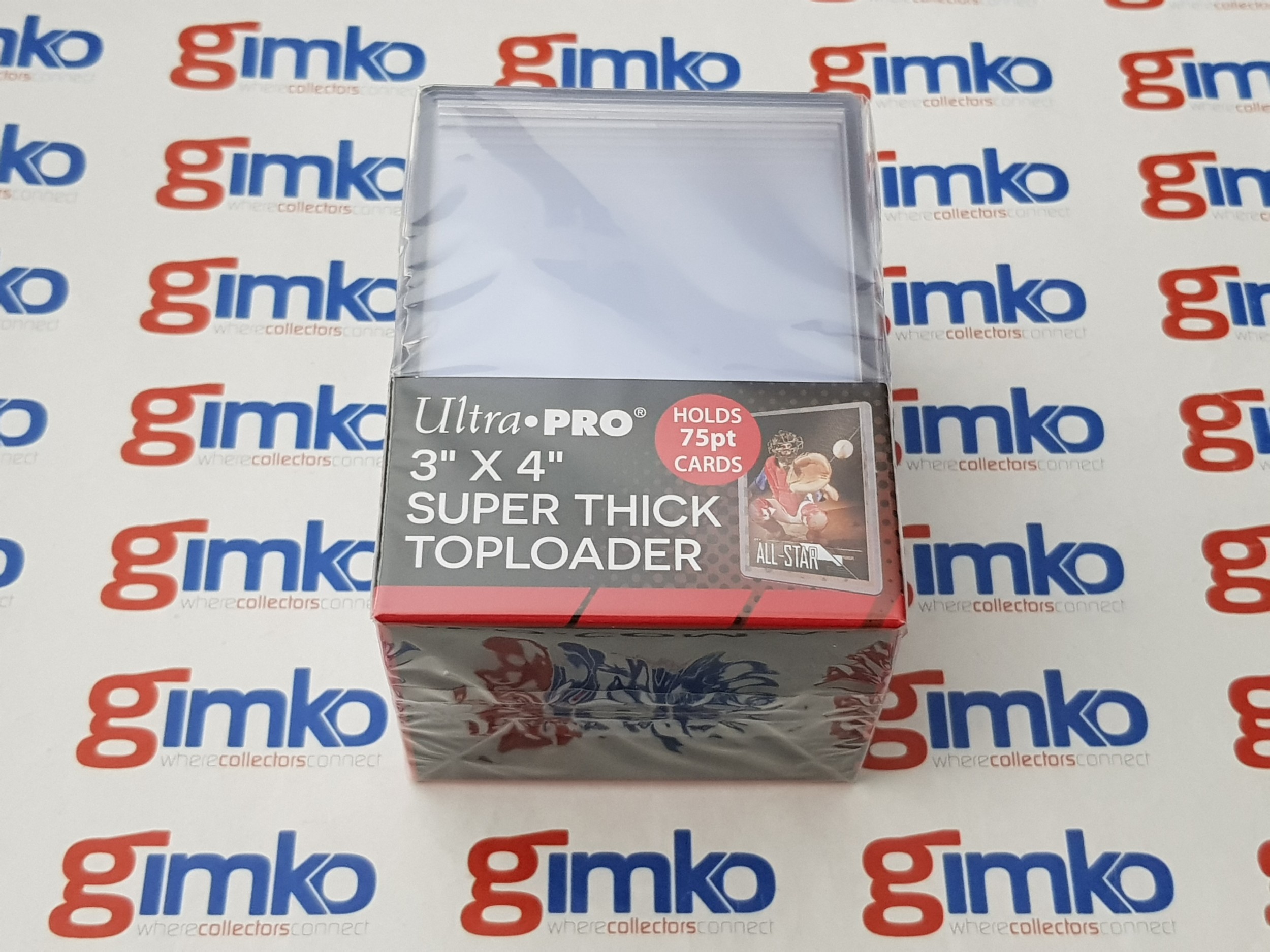 Protect your valuable trading cards with Ultra PRO's super clear 3" x 4" "Thick" Toploaders for standard-sized cards up to 75pt thickness. These rigid PVC plastic holders enclose the cards and keep them clean while preventing damage. Each pack comes with 25 individual pieces.