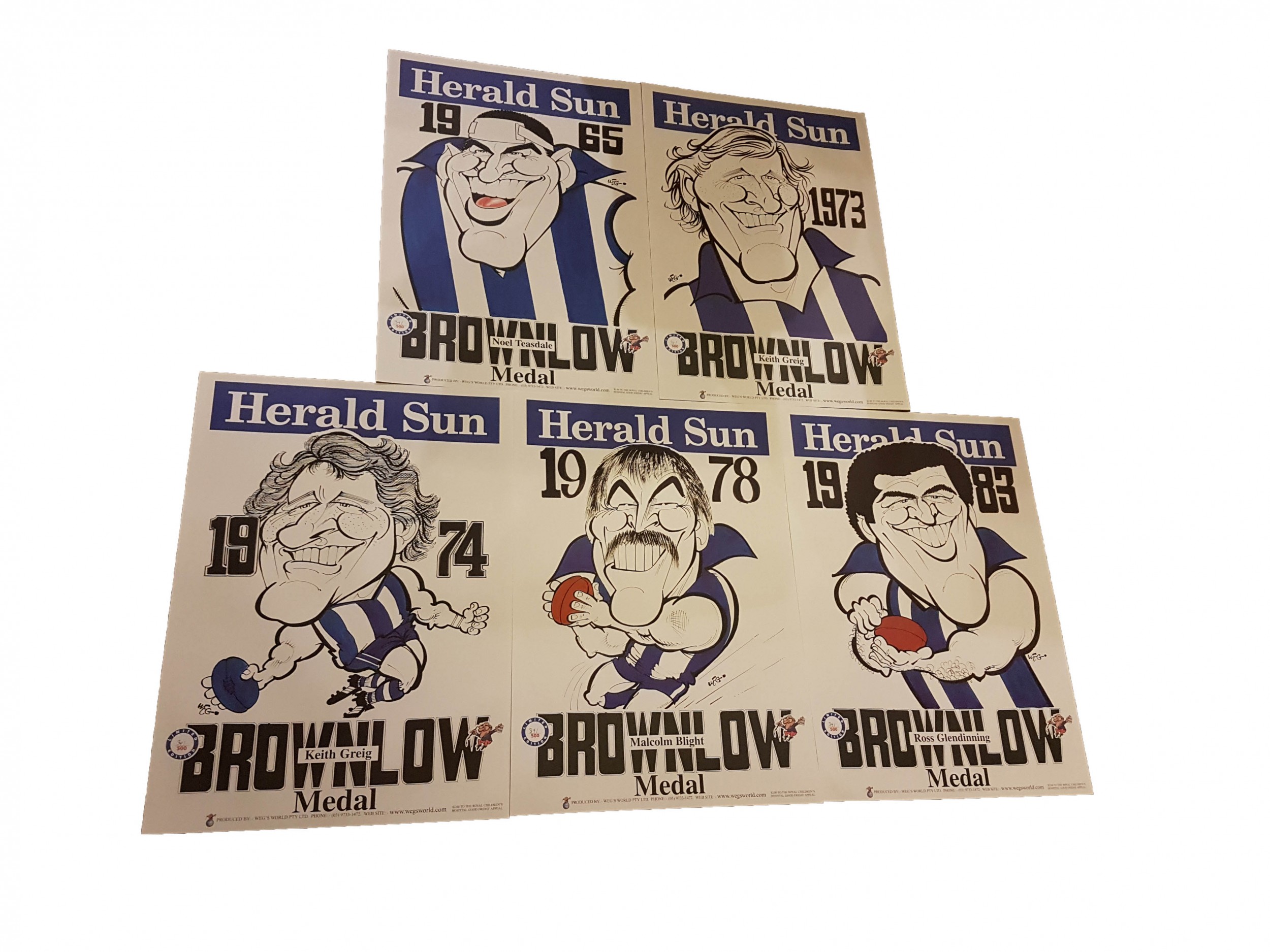 WEG POSTER SET NORTH MELBOURNE X 5 1965 ~ 1983 BROWNLOW WEG SET ALL SAME NUMBER - FREE POSTAGE